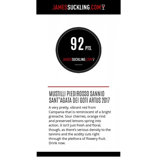VINIFICAZIONE E AFFINAMENTO Uva del vigneto Pozzillo nel comune di Sant’Agata dei Goti, selezionata e raccolta a mano. Fermentazione in vasi di ceramica per circa 3 settimane. Maturazione sempre in vasi di ceramica per circa 12 mesi, cui segue un affinamento in bottiglia di minimo 6 mesi.